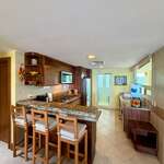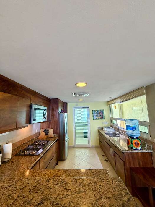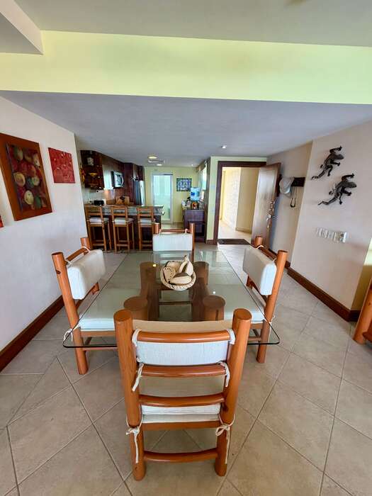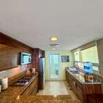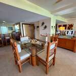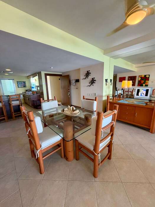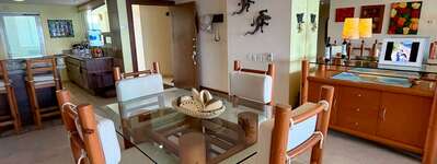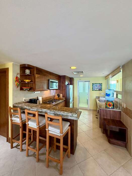 The kitchen features granite countertops, upgraded beautiful parota wood cupboards with a bar counter and the large laundry room is off the kitchen with a washer and dryer and washing tub. The dining area has a lovely glass-top table and seating for 8 people with a ceiling fan and a mirrored wall which gives a sense of space and light with great reflected views along the bay.